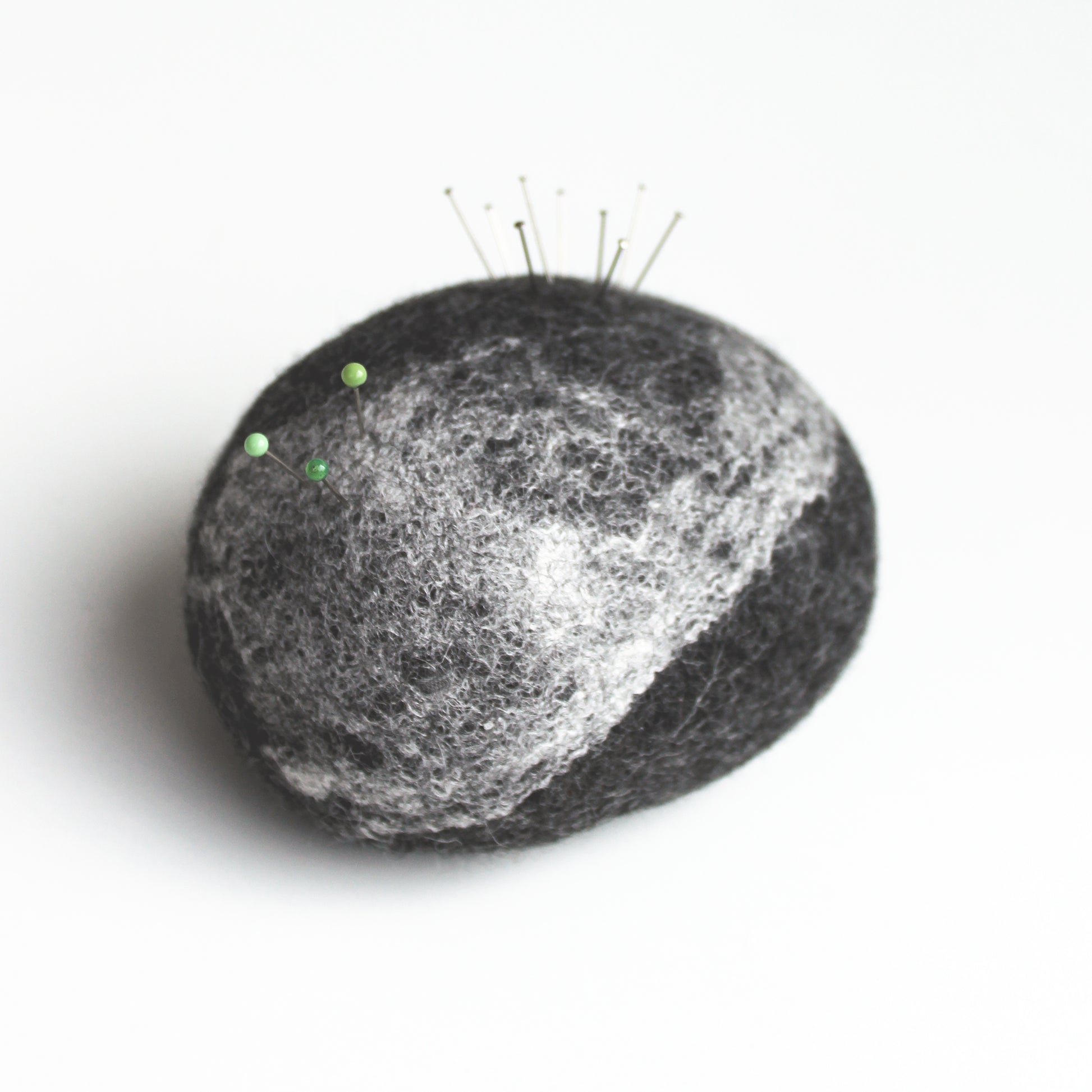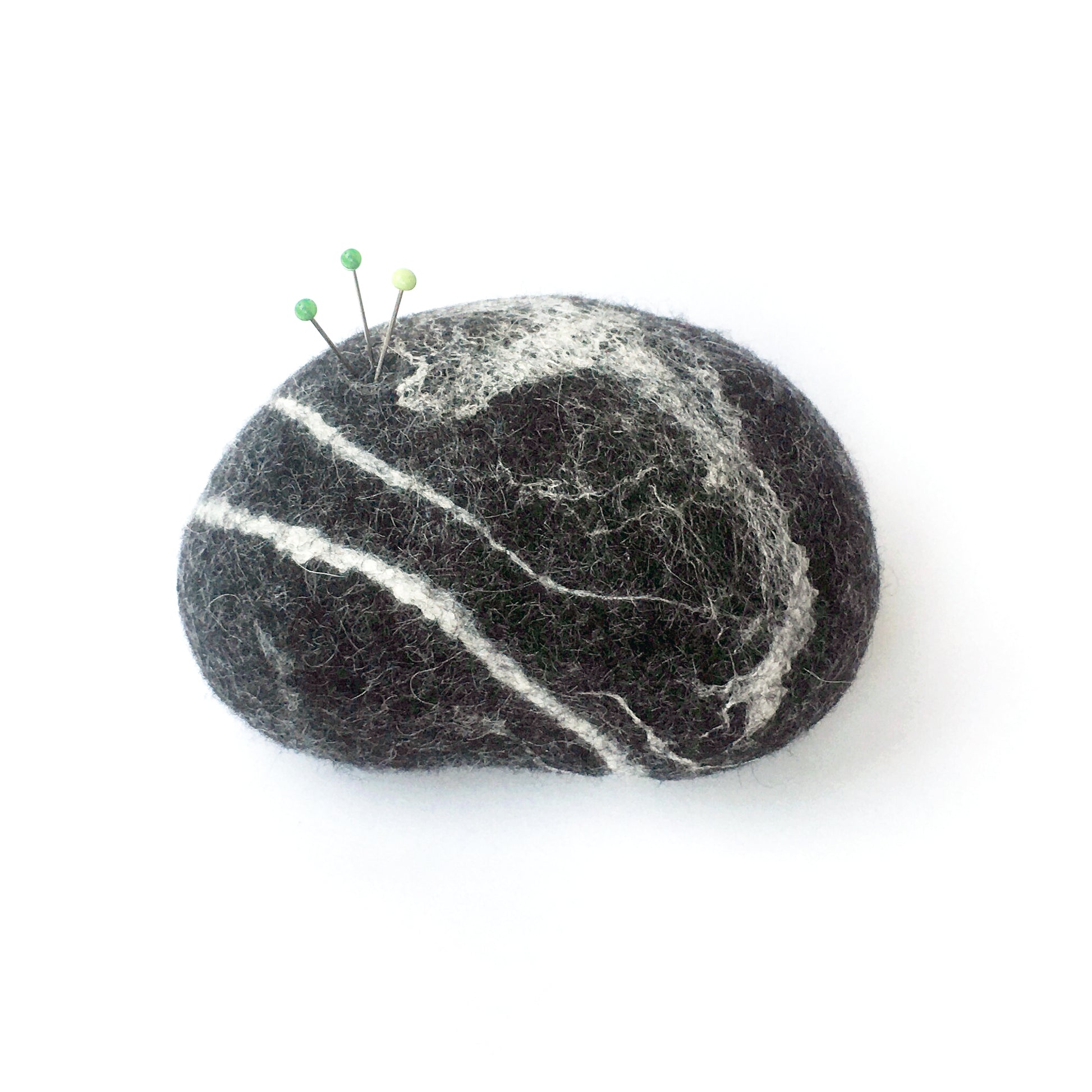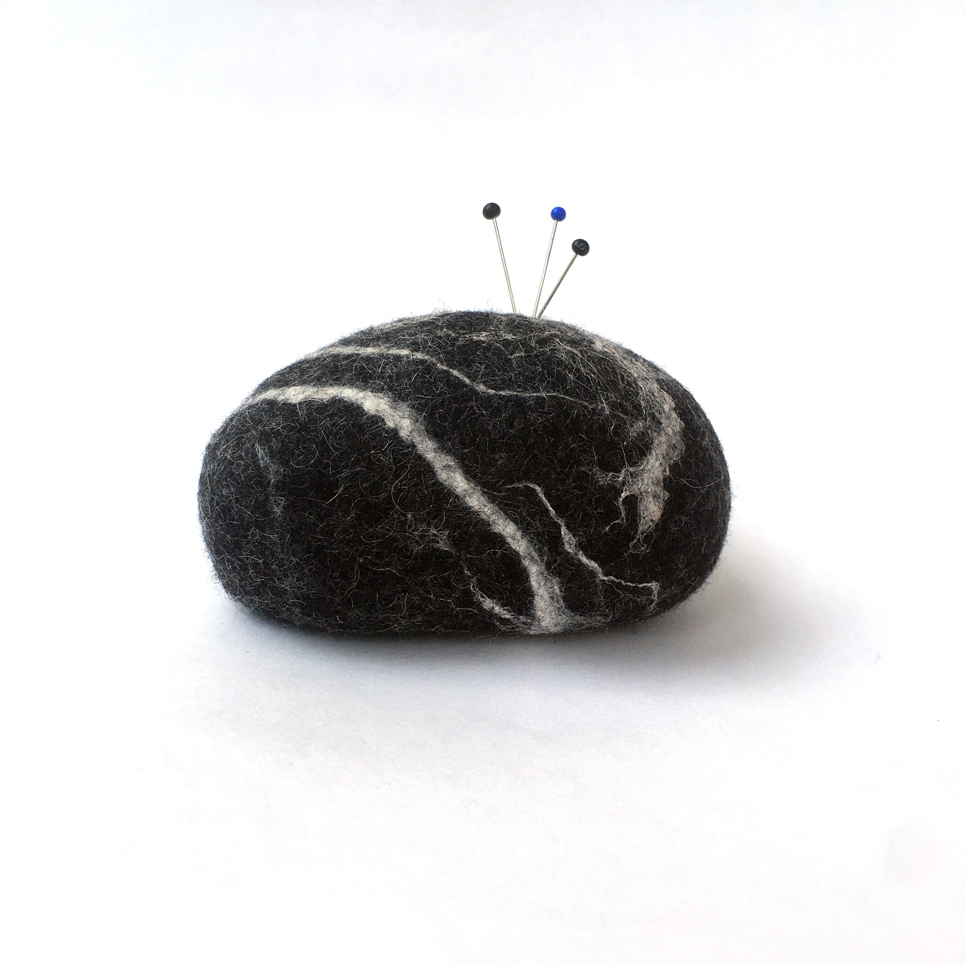 Dieses einzigartige Kieselstein-Nadelkissen aus Filz ist mit superweicher Merinowolle gefilzt. Die gleiche Merinowolle wird auch für die Füllung anstelle von synthetischem Schaumstoff verwendet. Die dekorativen Stein-Adern auf der Oberfläche sind mit Seidenfaser platziert. Die Sohlen des Nadelkissens sind flach verarbeitet, sodass sie schön auf der Arbeitsfläche liegen. Es ist aber auch eine hübsche Dekoration auf eurem Schreibtisch. Wenn ihr ein Armnadelkissen sucht, dann ist die Größe S, ein kleineres Filz-Kieselstein-Nadelkissen mit Gummiband (Naturkautschuk und Bio-Baumwolle), eure Wahl.