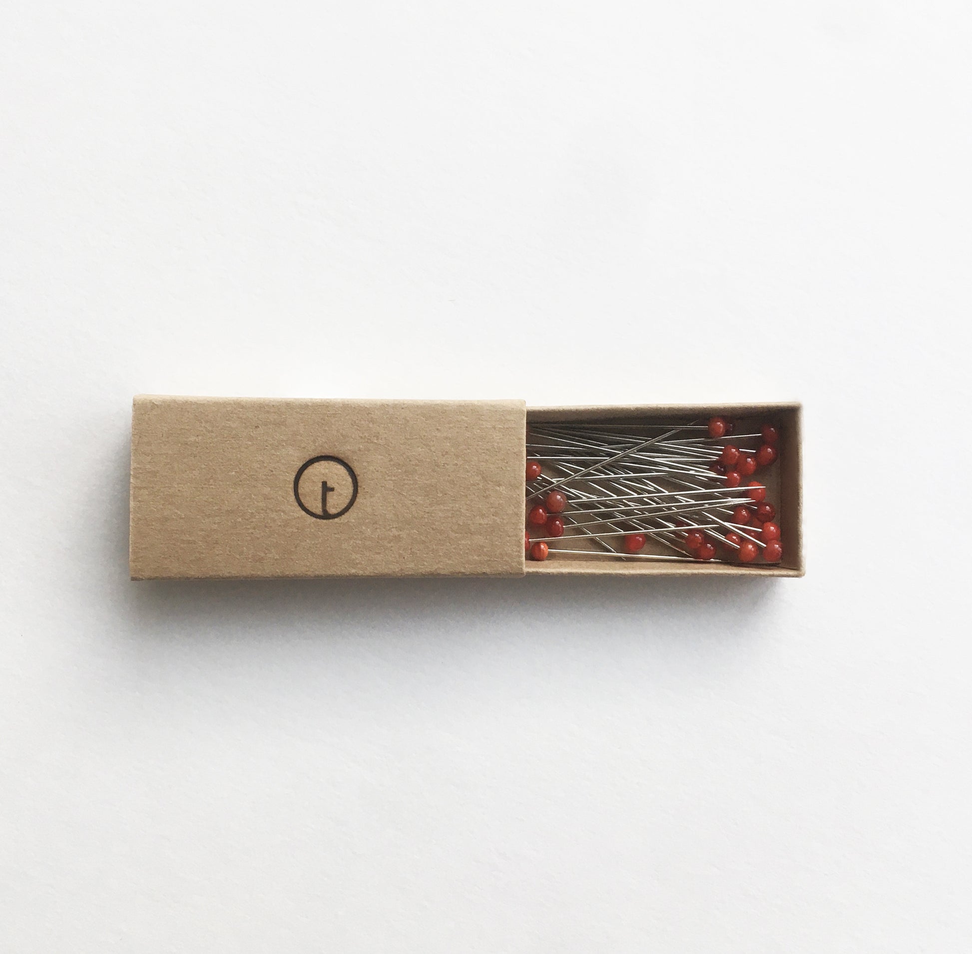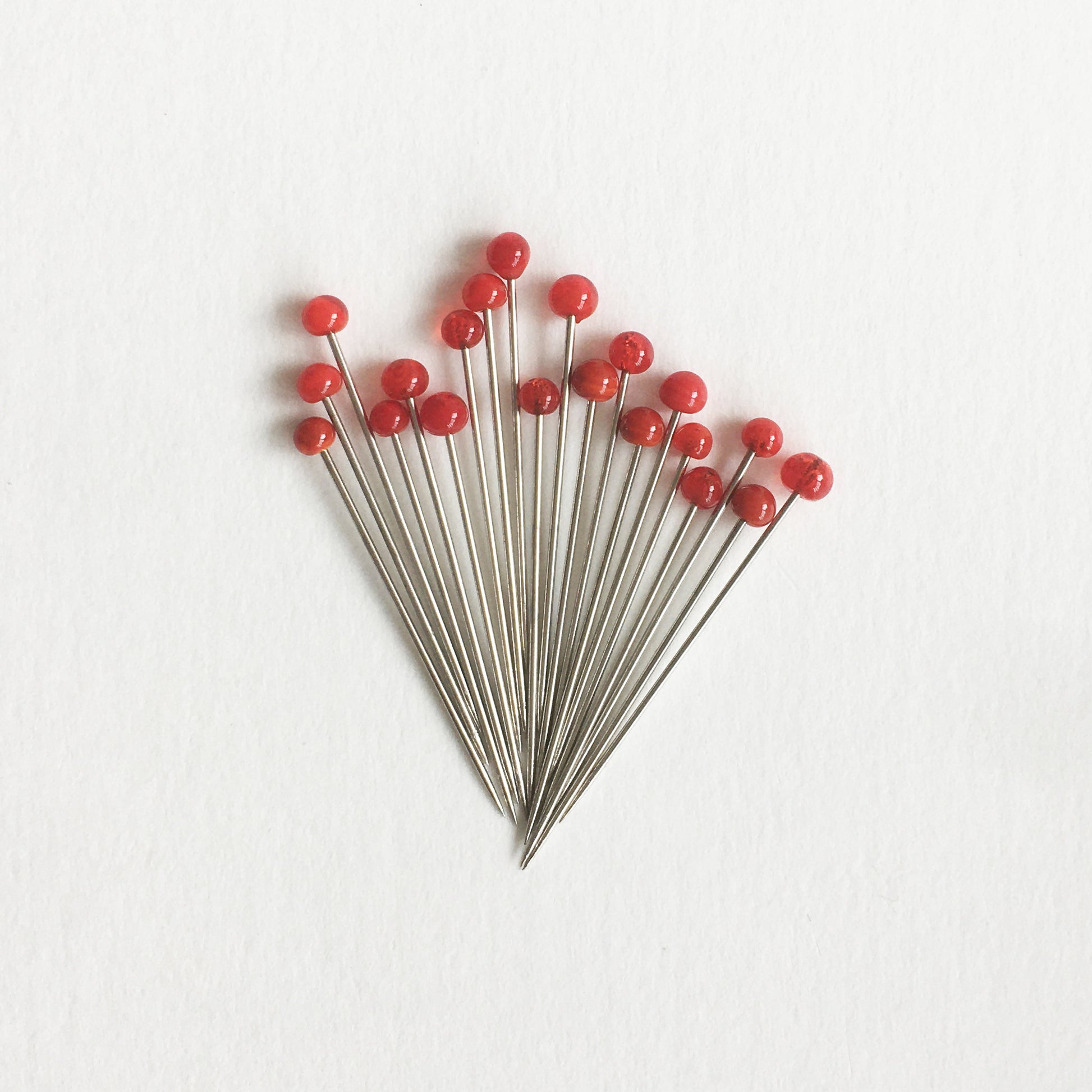 Extra feine Stahlnadeln mit rotem Glaskopf. Der gebräuchlichste Typ von Nähnadeln, der für leichte bis mittelschwere Stoffe verwendet wird.
