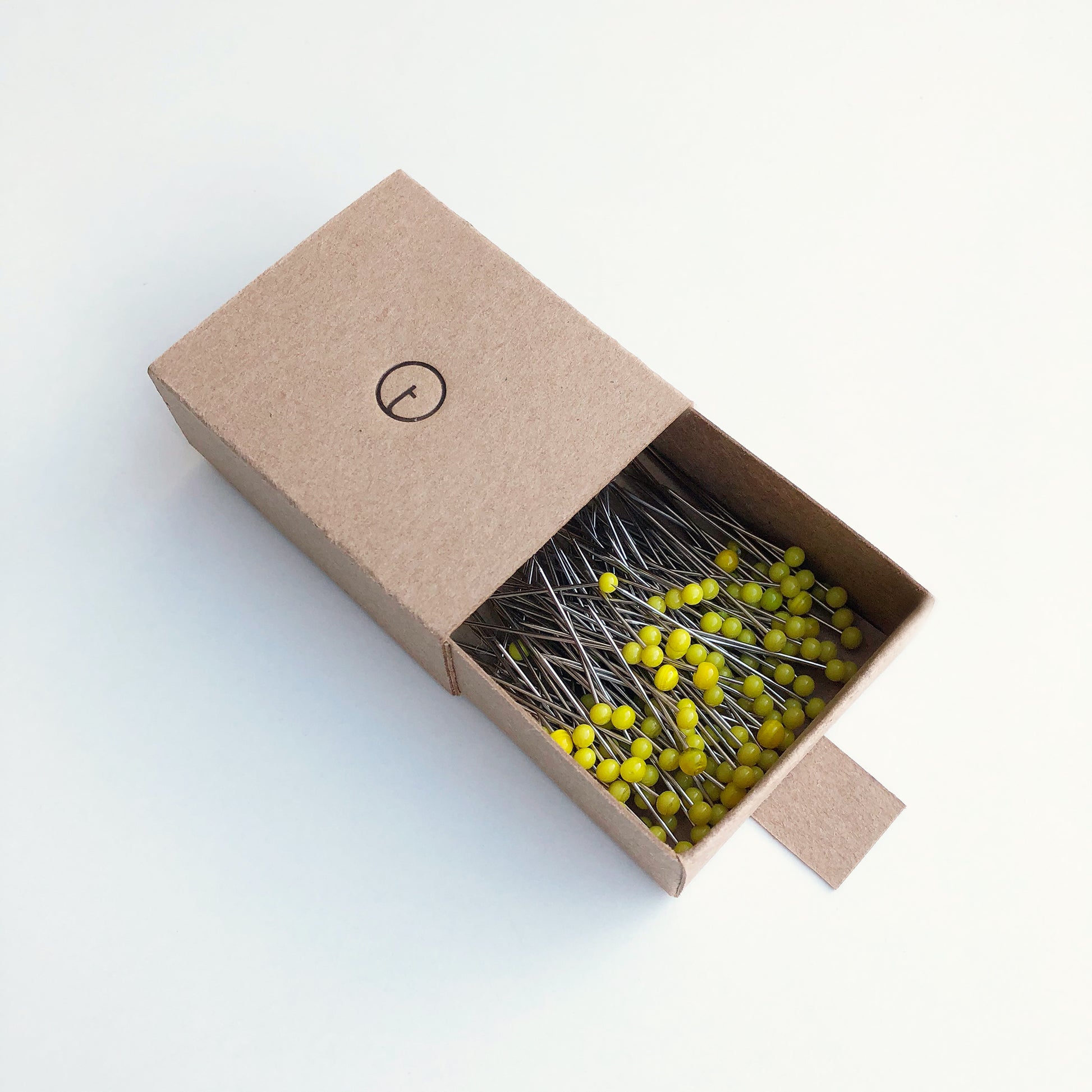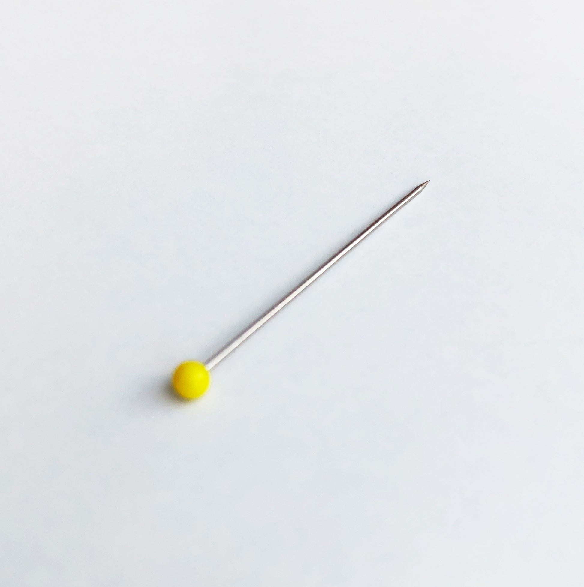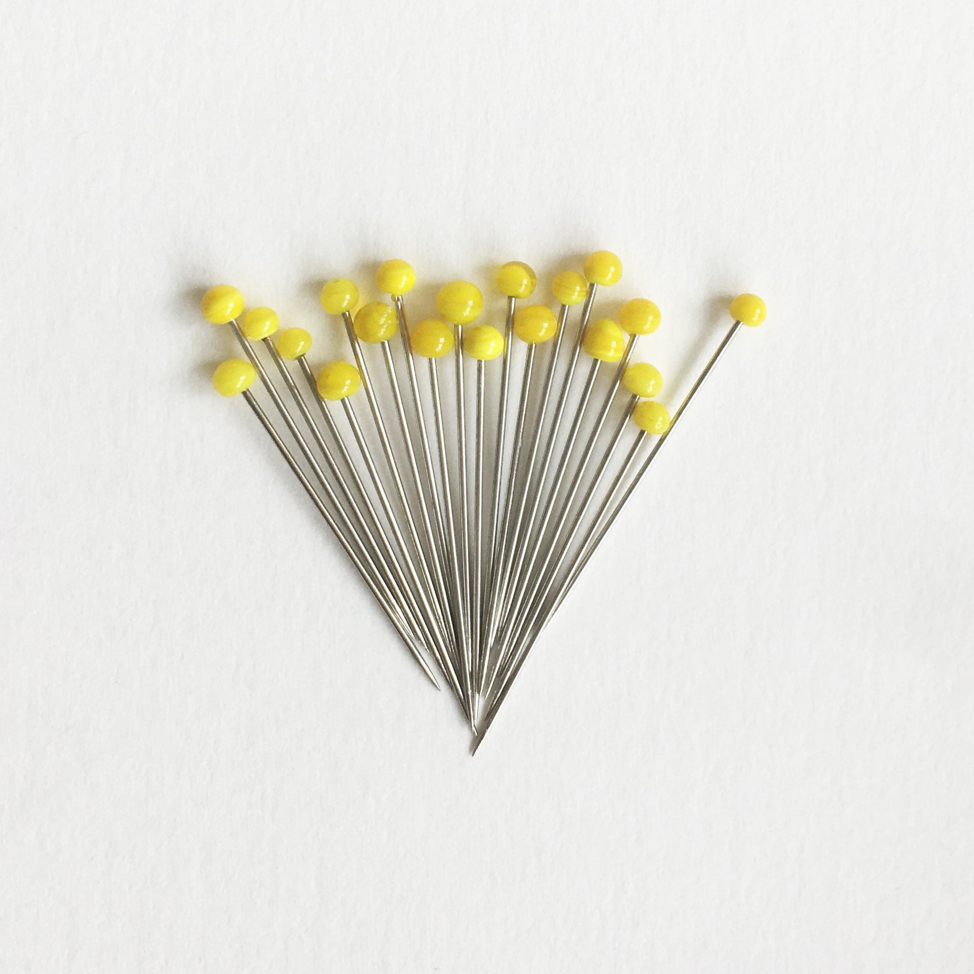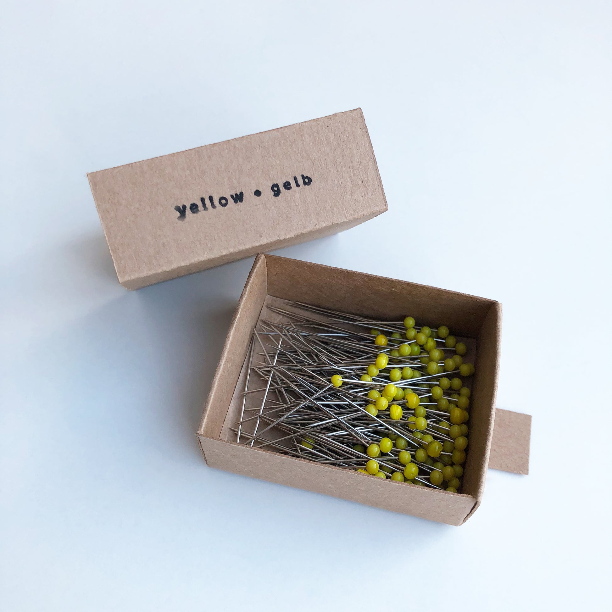 Kleinere Schachtel mit 20 Stecknadeln mit gelbem Glaskopf HIER KLICKEN