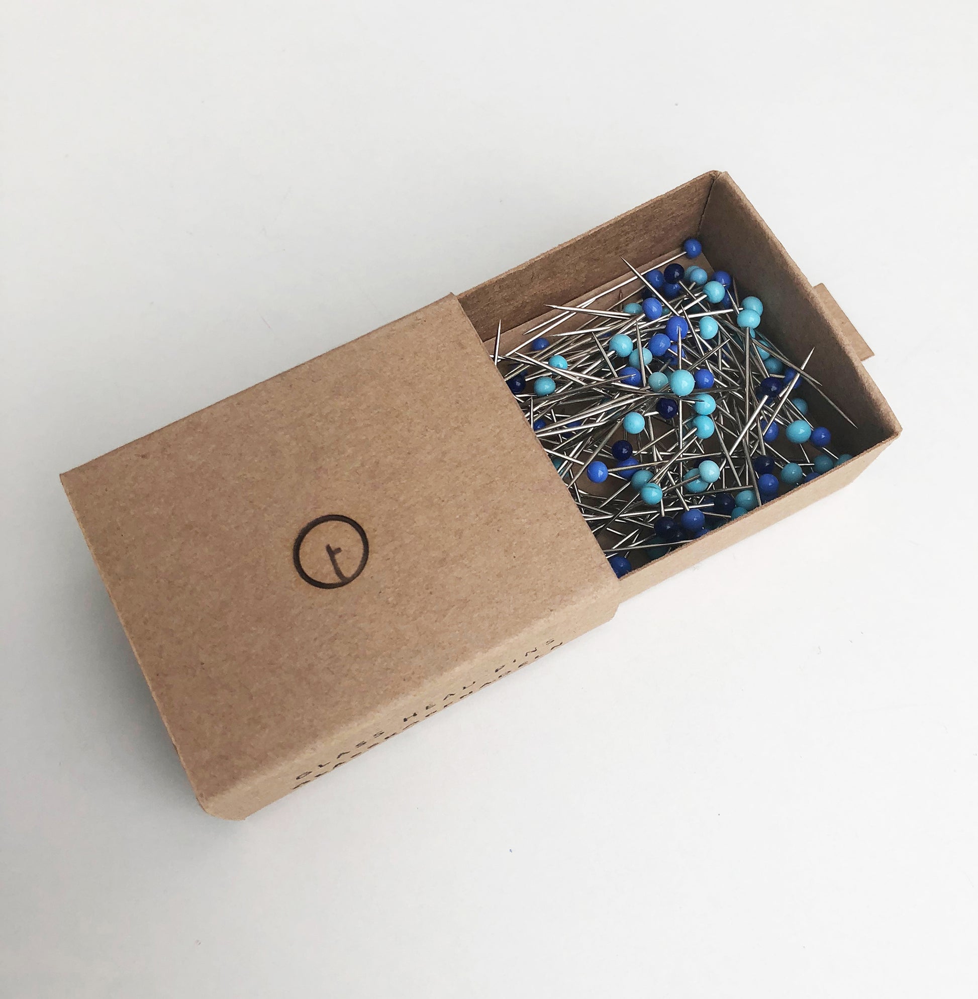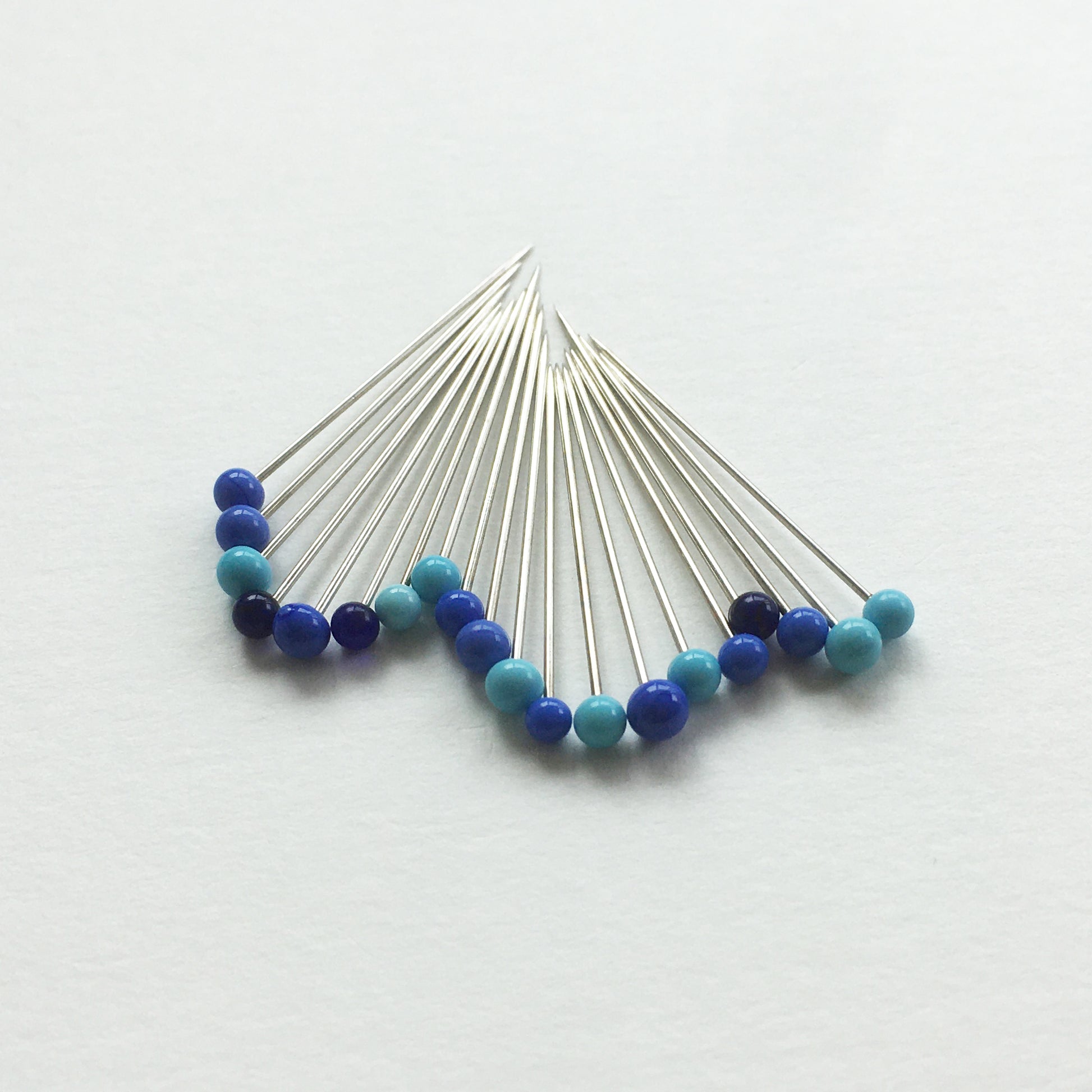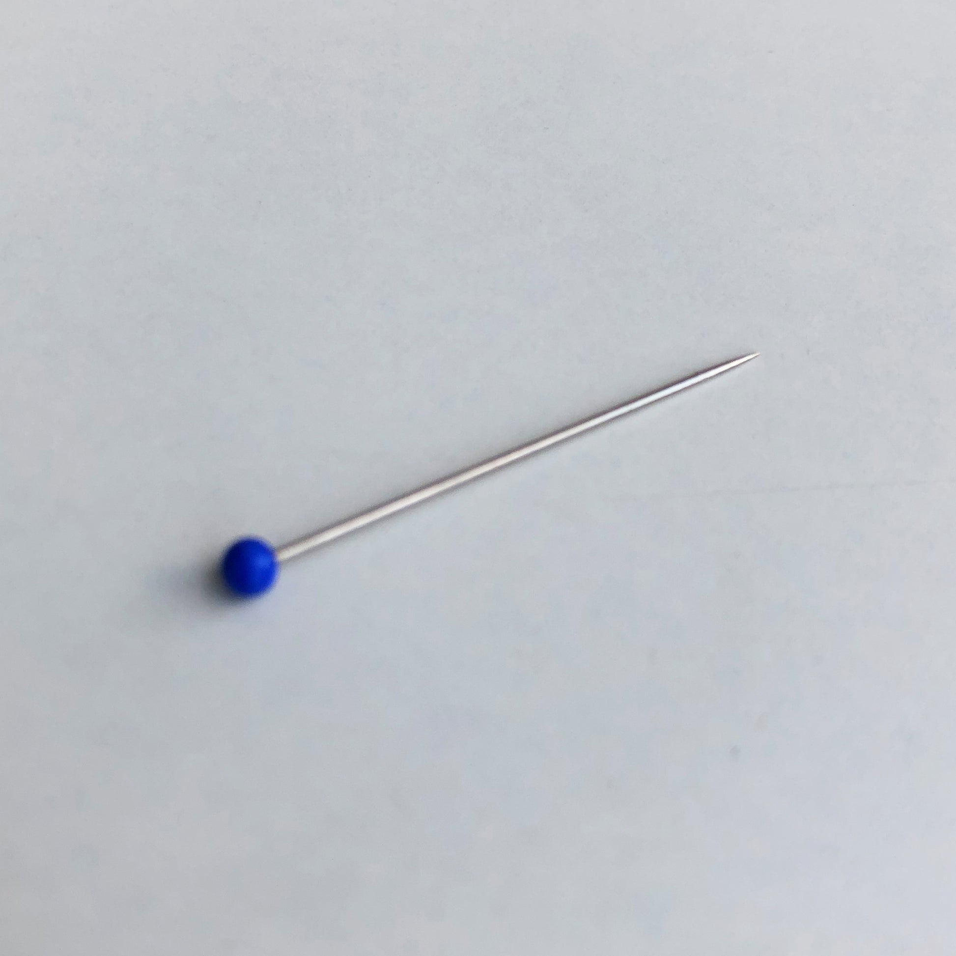 Fine steel pins with blue glass heads. The most common type of sewing pin used for light- to medium-weight fabrics.