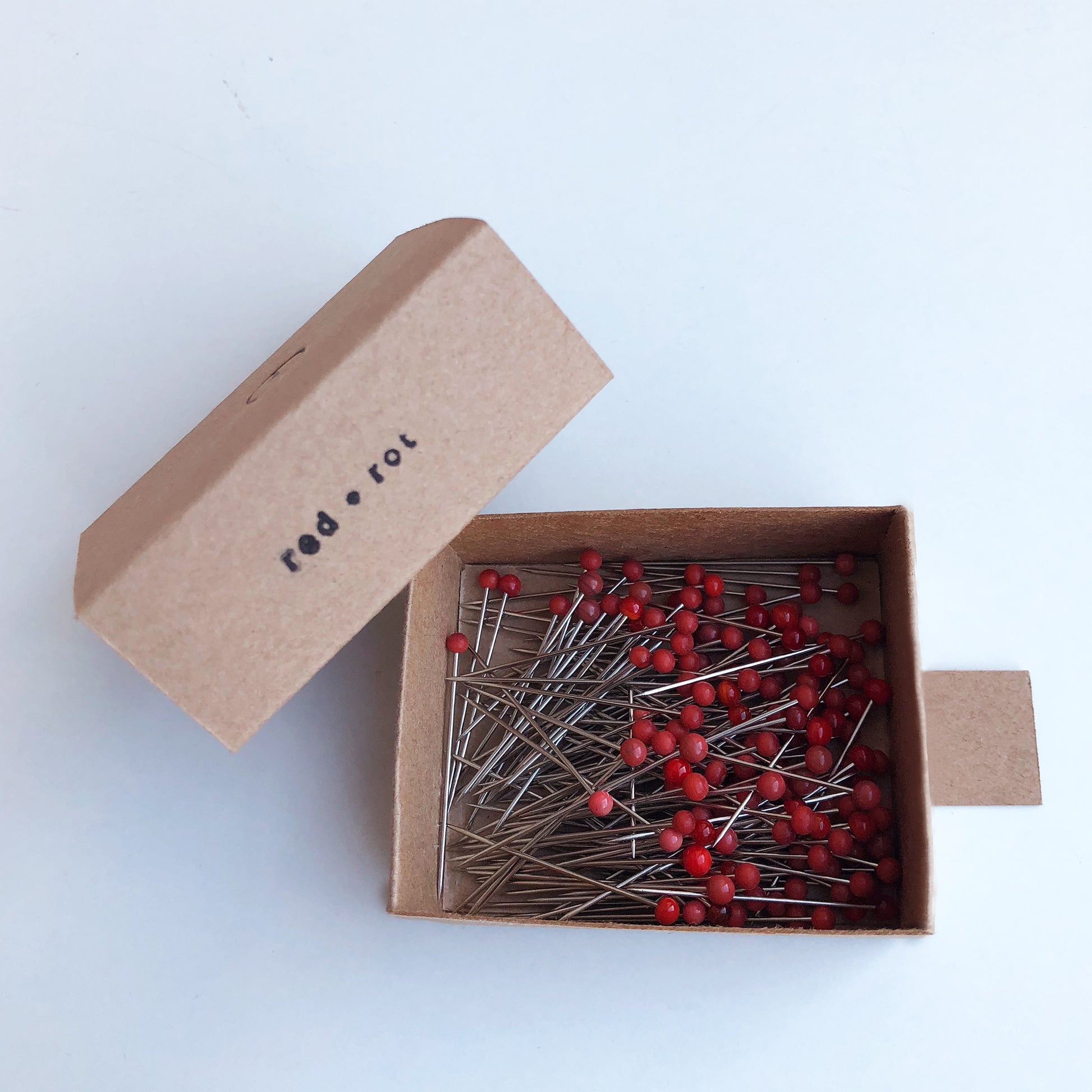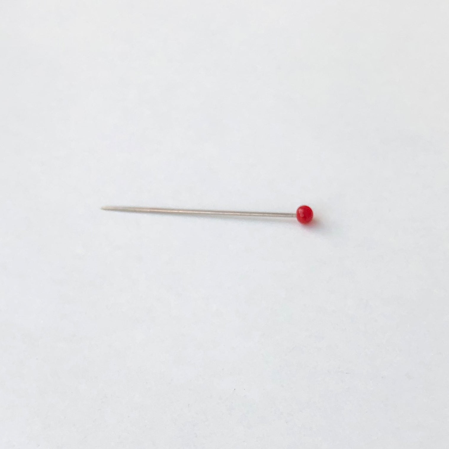 Fine steel pins with red glass heads. The most common type of sewing pin used for light- to medium-weight fabrics.